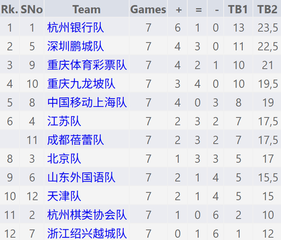 七轮事后,杭州银行队、深圳鹏城队、重庆体育彩票队位列惯例赛前三名。10月2日将进行惯例赛第八轮比赛。