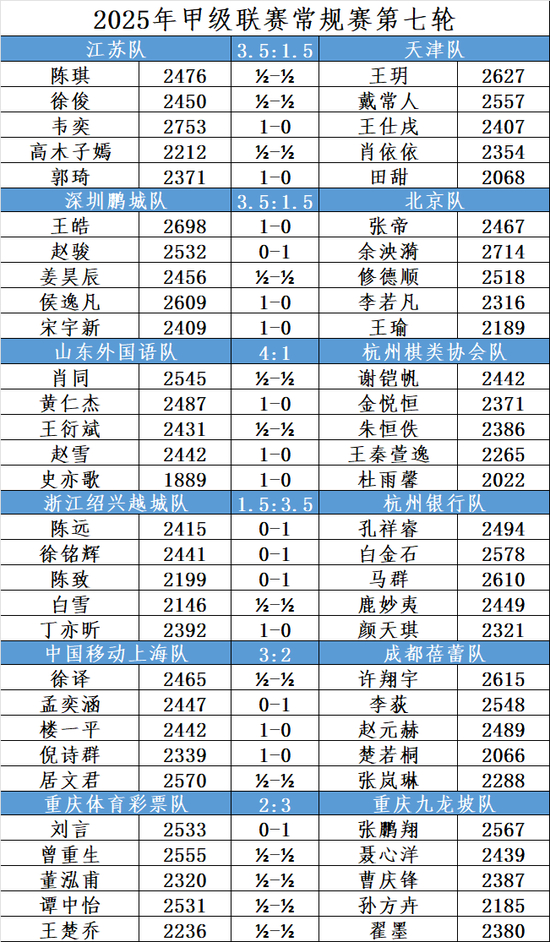 王皓、侯逸凡提醒深圳鹏城俱乐队列本轮以3.5比1.5大捷主场作战的北京队。卫冕冠军重庆体育彩票队在与重庆九龙坡队的比赛中败下阵来,以2比3憾负敌手。中国出动上海队凭借楼一祥和倪诗群的胜局,以3比2治服成齐蓓蕾队。韦奕、郭琦提醒江苏队以3.5比1.5大捷天津队。山东番邦语学校队则以4比1大捷升班马行杭州棋类协会队。