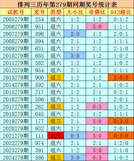 012路分析:历史上陈设三第279期同时奖号中,012路奖号总个数比为23:17:20,012路奖号轮空期数比为4:9:6,本年第279期瞻望2路号码走冷轮空,看好012路比开出2:1:0。