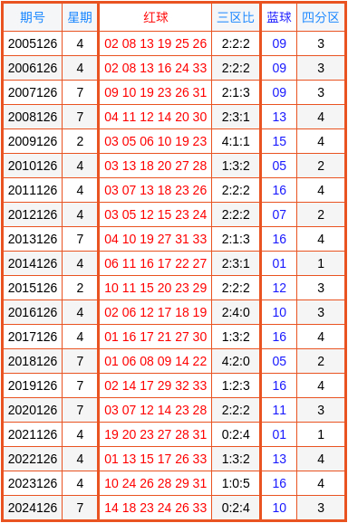 双色球积年第126期奖号分区详备数据